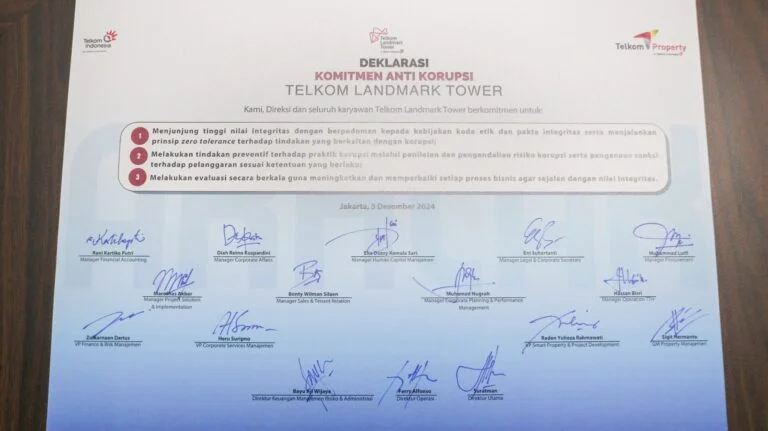 Pada tanggal 5 Desember 2024, PT Telkom Landmark Tower (TLT) melaksanakan Deklarasi Komitmen Anti-Korupsi yang berlangsung di lantai 3 (tiga) Gedung Telkom Landmark Tower. Kegiatan ini menjadi langkah konkret perusahaan dalam memperkuat integritas, transparansi, dan akuntabilitas di lingkungan kerja, sejalan dengan nilai-nilai Telkom Group.
